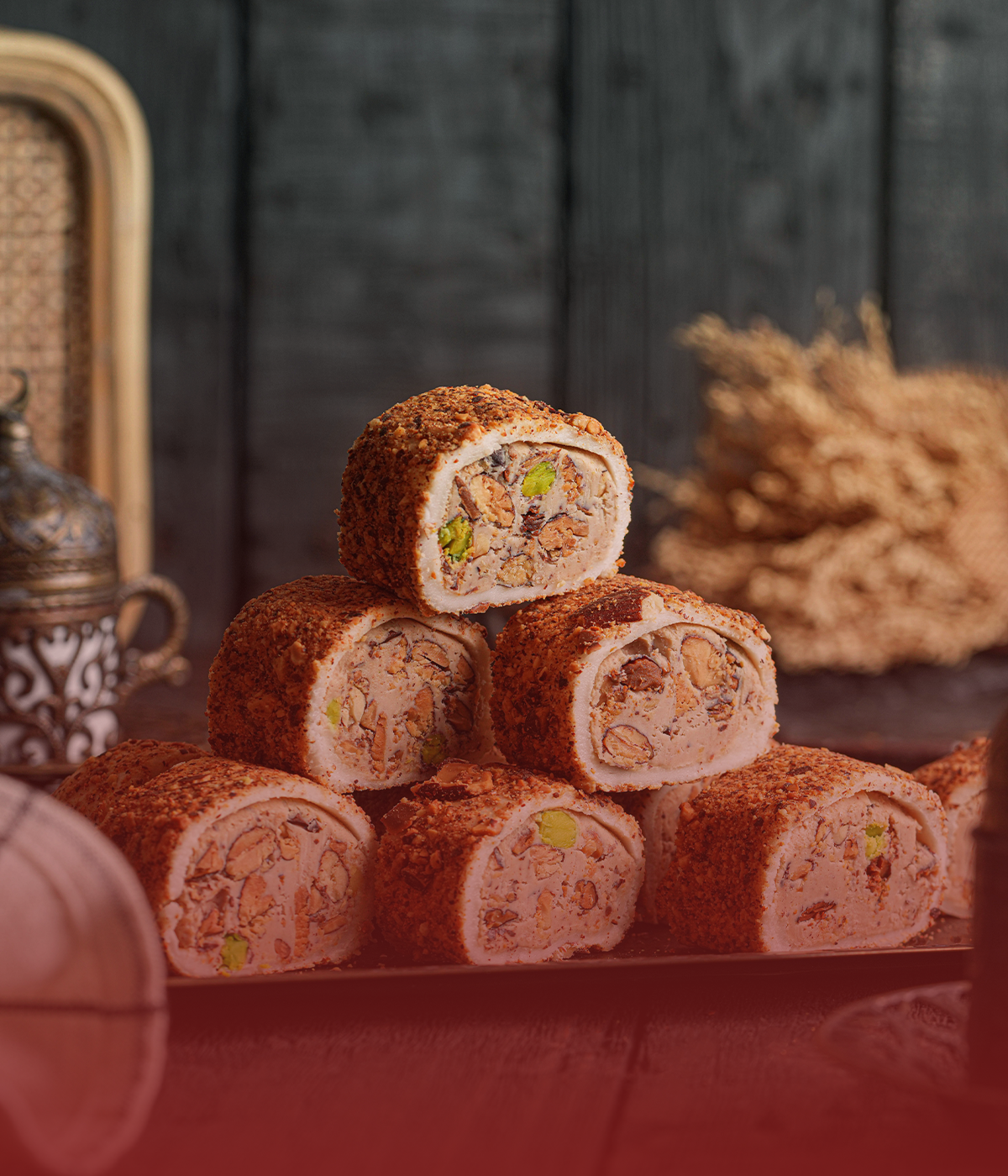 رولات حلقوم تركي فاخر محشوة باللوز ومغلفة بطبقة لذيذة. طعم غني ومكونات طبيعية عالية الجودة