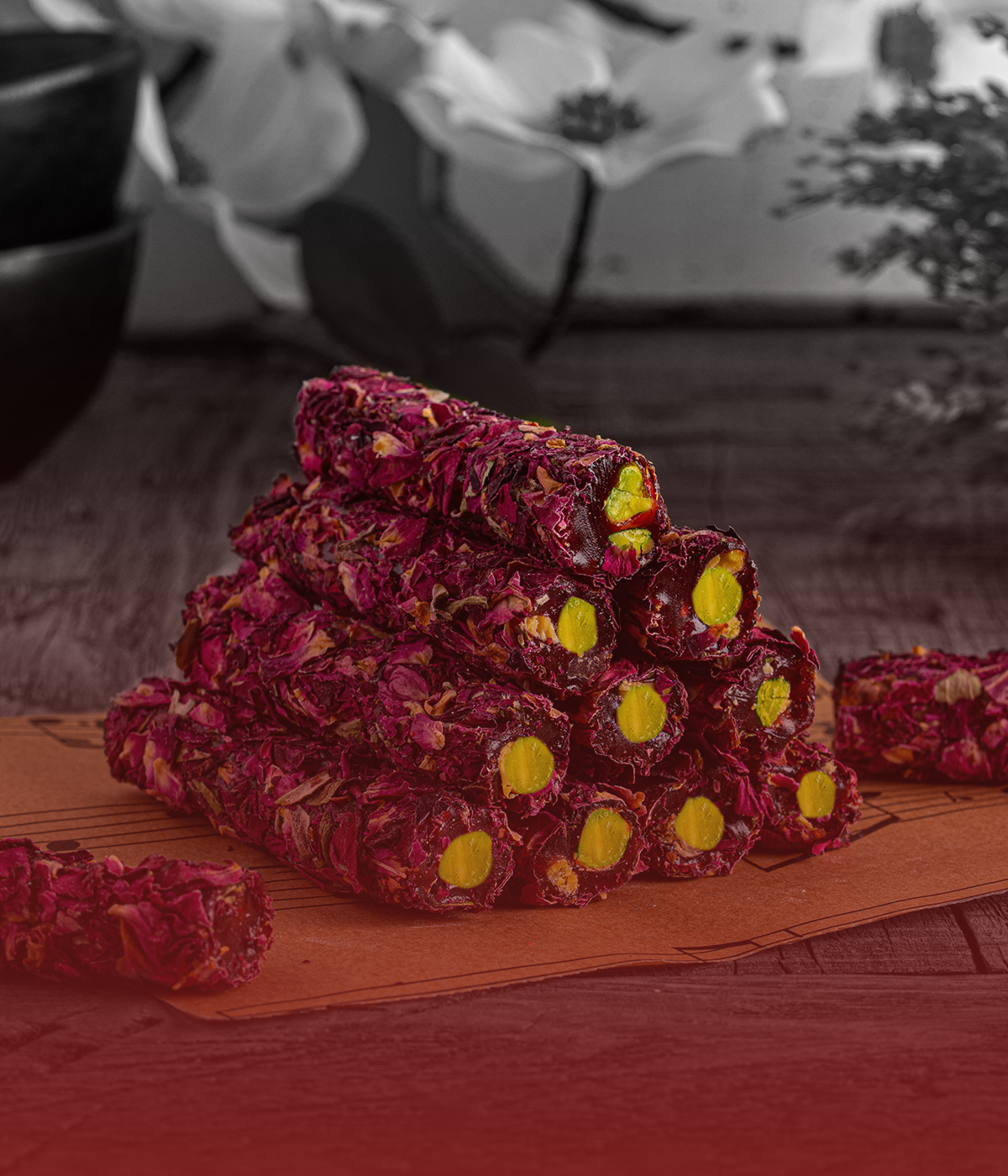 أصابع حلقوم تركي فاخرة مغلفة ببتلات الورد الطبيعي العطرة، ومحضرة بدون إضافة سكر. تتميز بحشوة غنية من حبات الفستق الحلبي الكاملة، لتمنحك توازناً مثالياً بين عبق الورد الساحر والقرمشة اللذيذة في خيار صحي وأصيل